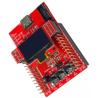 用2个2.54mm间距 2*15双排孔引出绝大部分引脚。两个排针间距设置成可以插入到面包板的间隔, 方便在面包板上实验。提供两排排针和一头排母一头排针的配件,不焊死,可自行选择焊接。